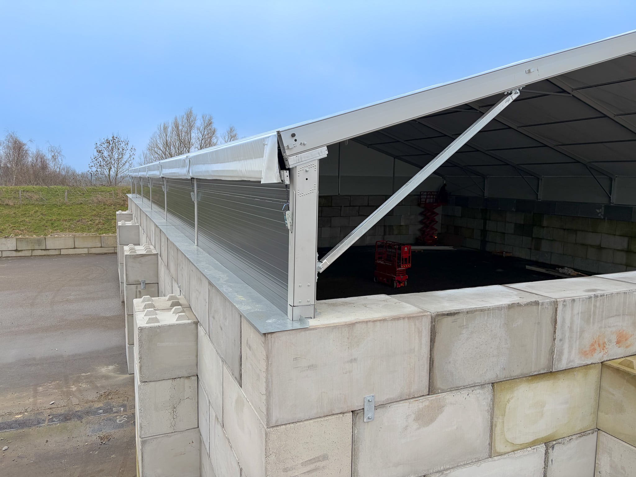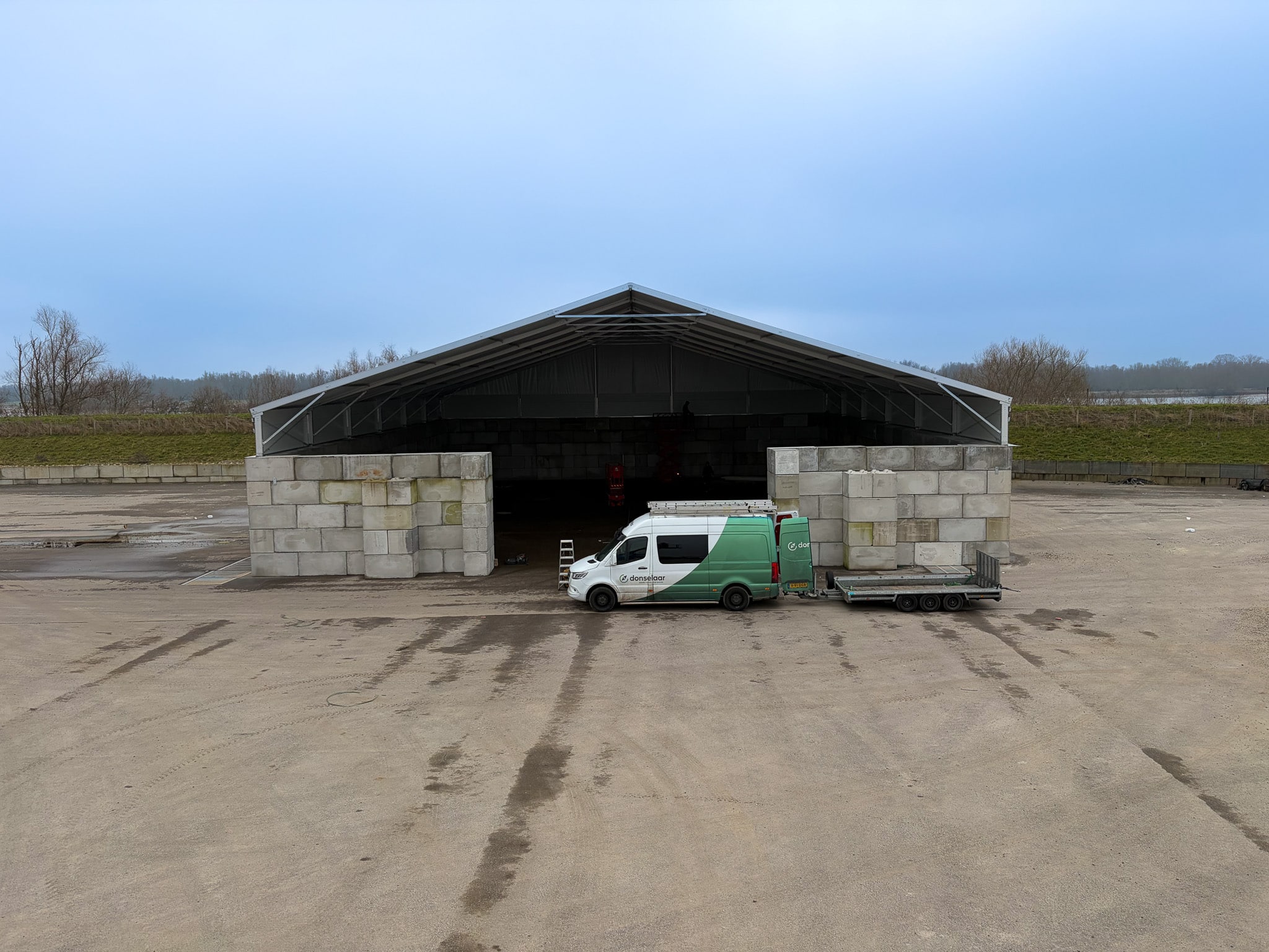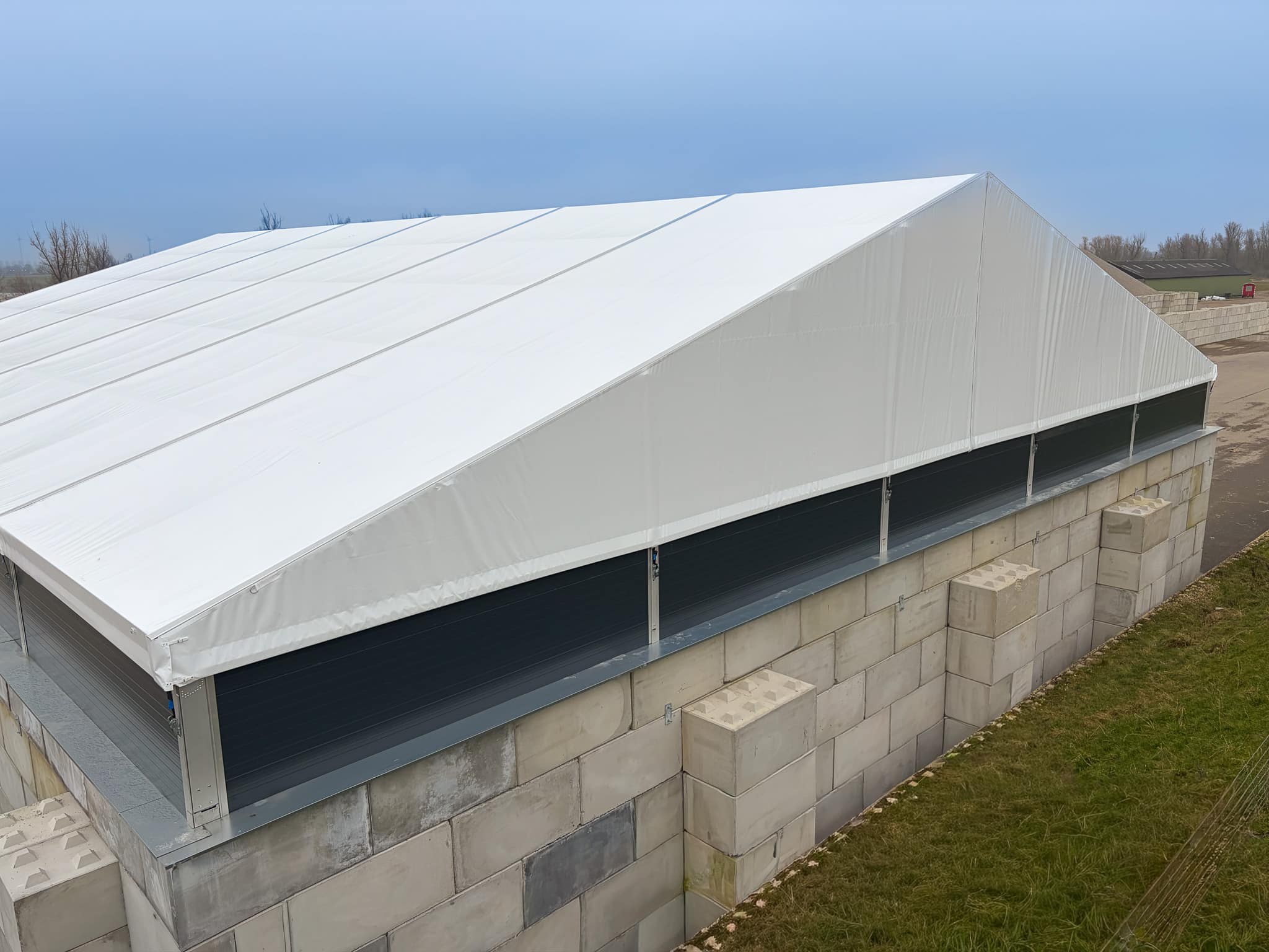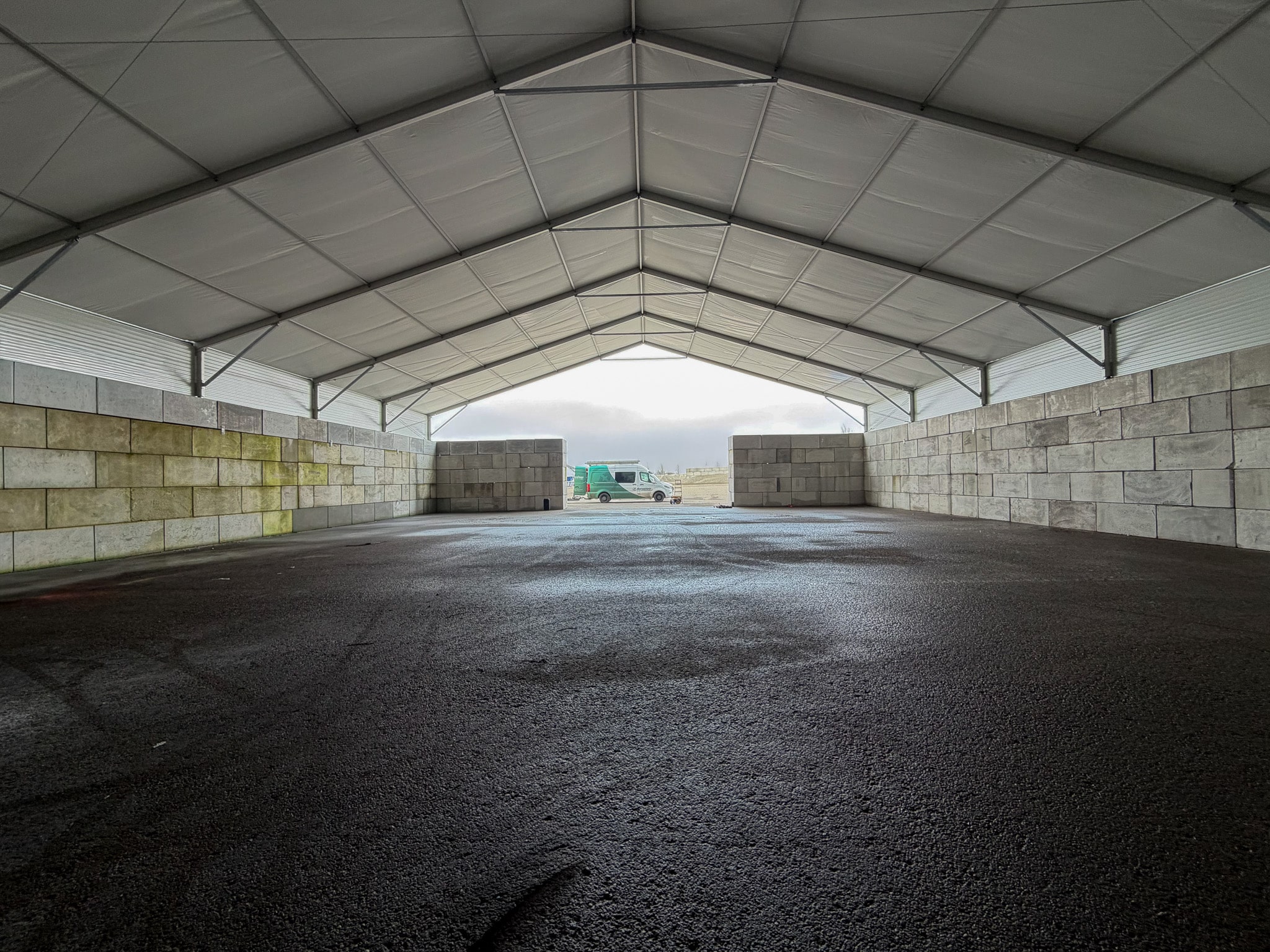 Voor Dekker Grondstoffen realiseerden we een T3 overkapping van 20 x 30 x 1,5 meter. De constructie wordt gebruikt voor de droge opslag van grondstoffen voor de bouw van kerncentrales. De hal is geplaatst op asfalt en betonblokken en uitgevoerd met een open voorgevel, zodat de opslagruimte goed toegankelijk blijft. Dankzij de ballastblokken en een nette waterafvoer vormt deze T3 een praktische en doordachte oplossing voor deze locatie.