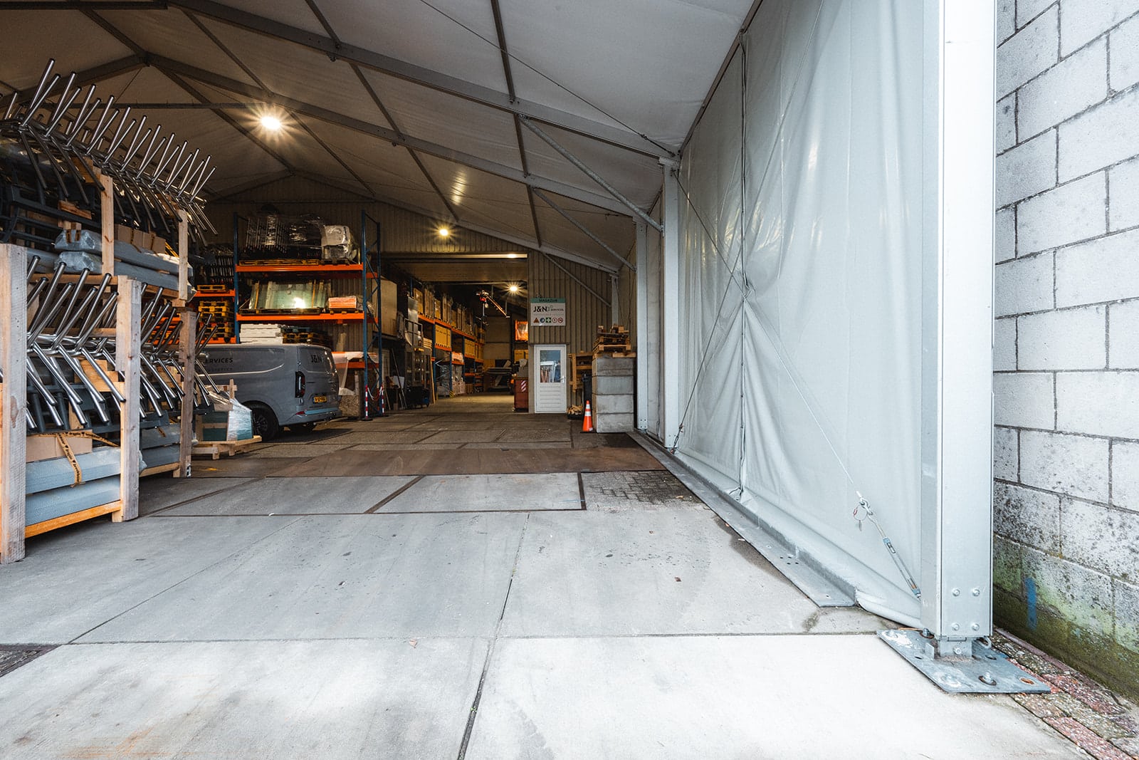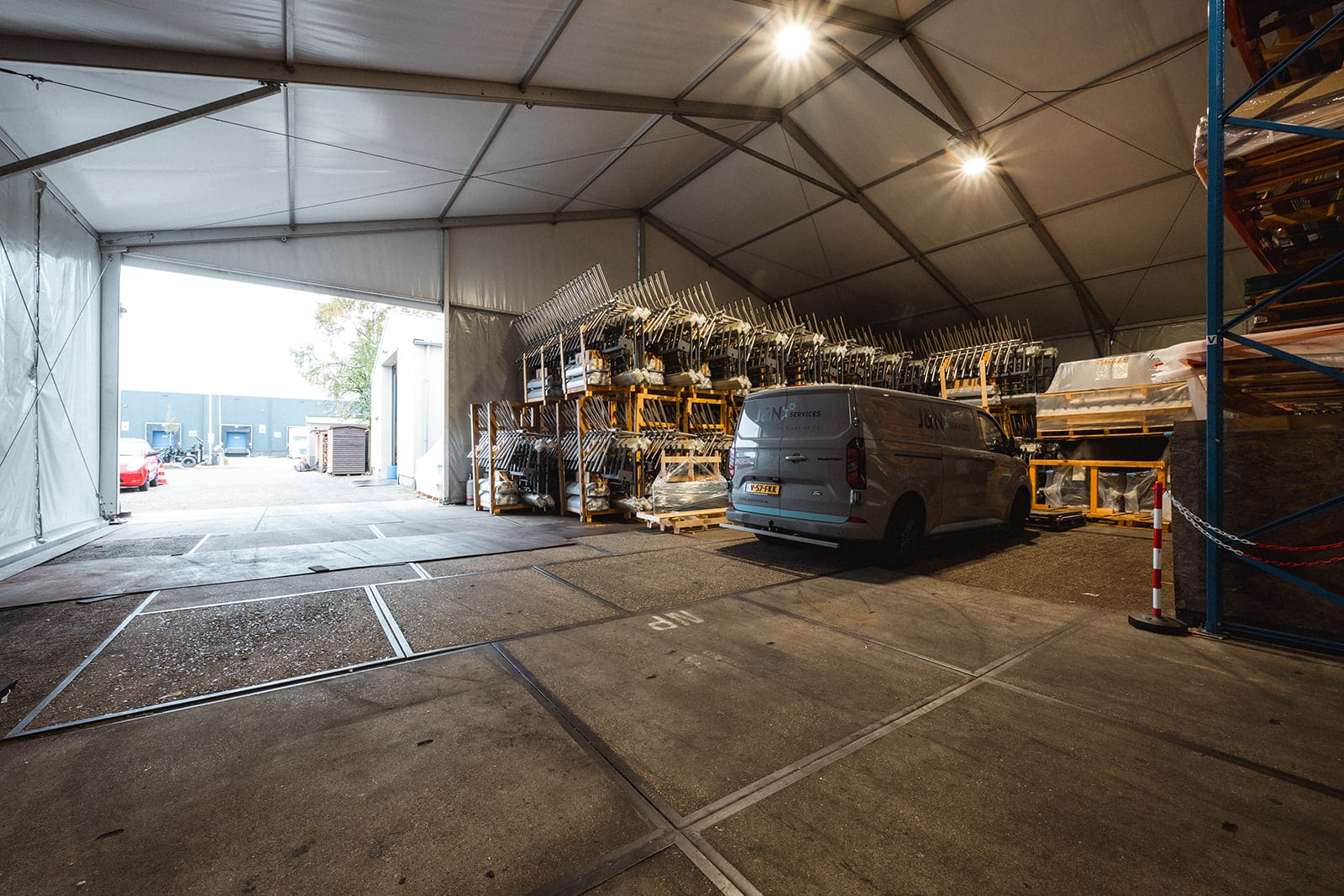 Voor J&N Services hebben we een T2-tenthal geplaatst die tijdelijk dienstdoet als magazijn. Een praktische en snelle oplossing waarmee het bedrijf direct extra opslagruimte kon creëren. De aluminium constructie biedt voldoende hoogte en stabiliteit, ideaal voor het veilig opslaan van materiaal en machines.