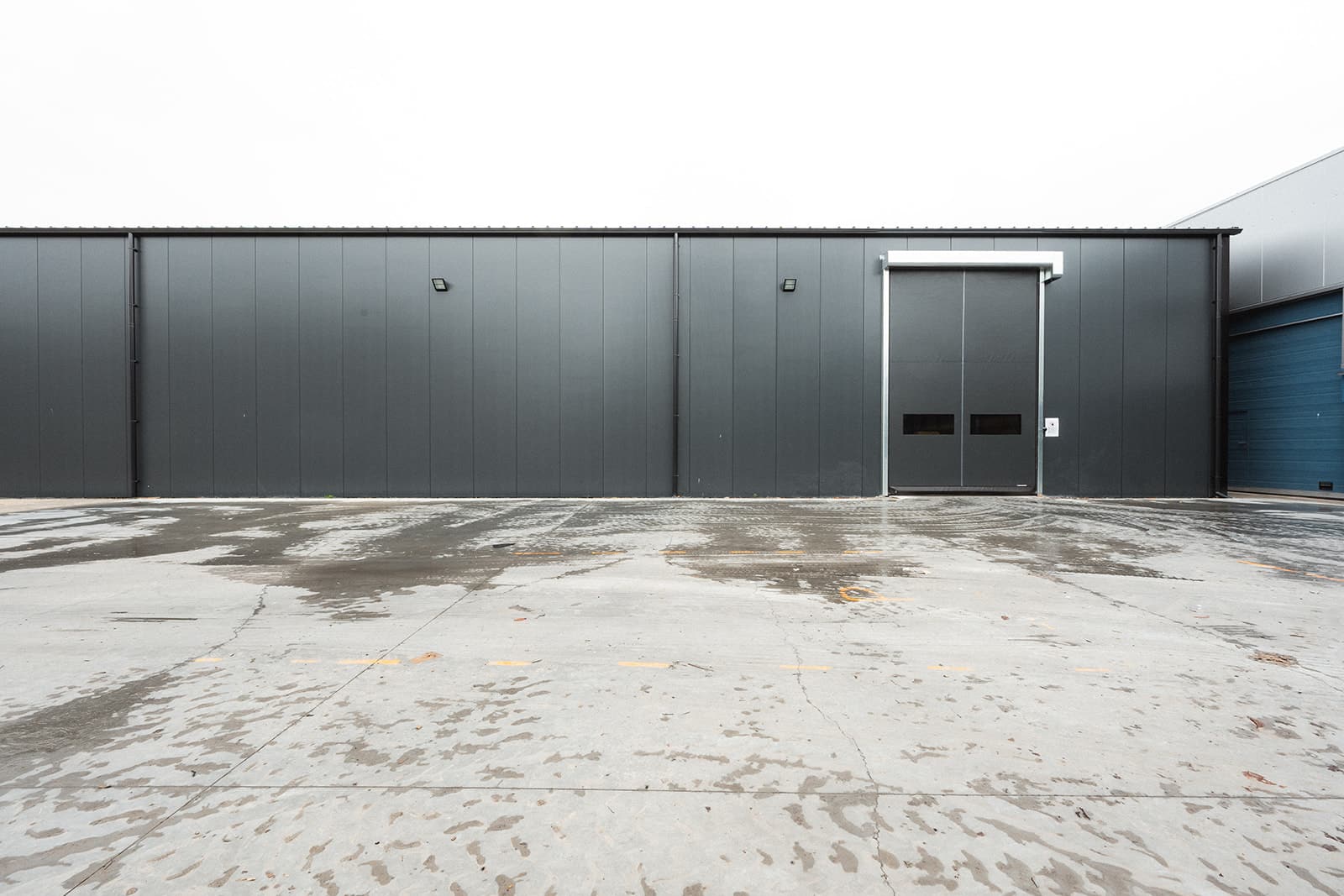 De hal is voorzien van een overheaddeur, één snelroldeur, vier loopdeuren en een corridor die de Flexhal verbindt met het bestaande pand. Vanaf het moment van akkoord stonden we binnen acht weken op locatie om te bouwen, precies volgens planning.