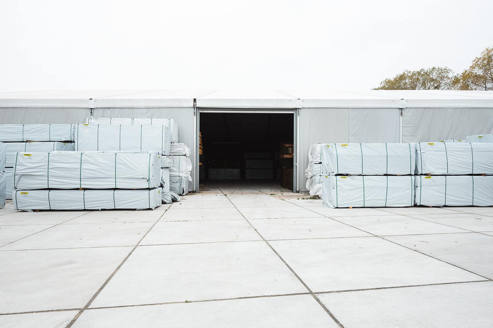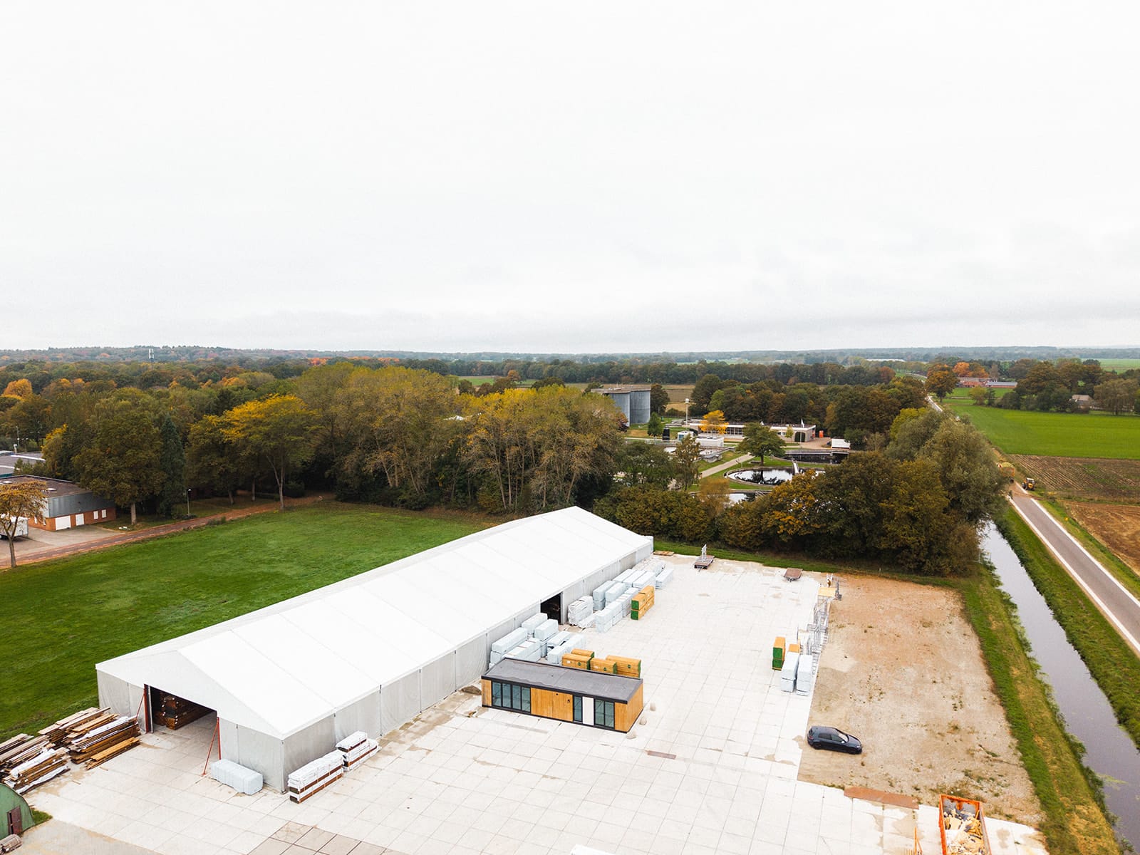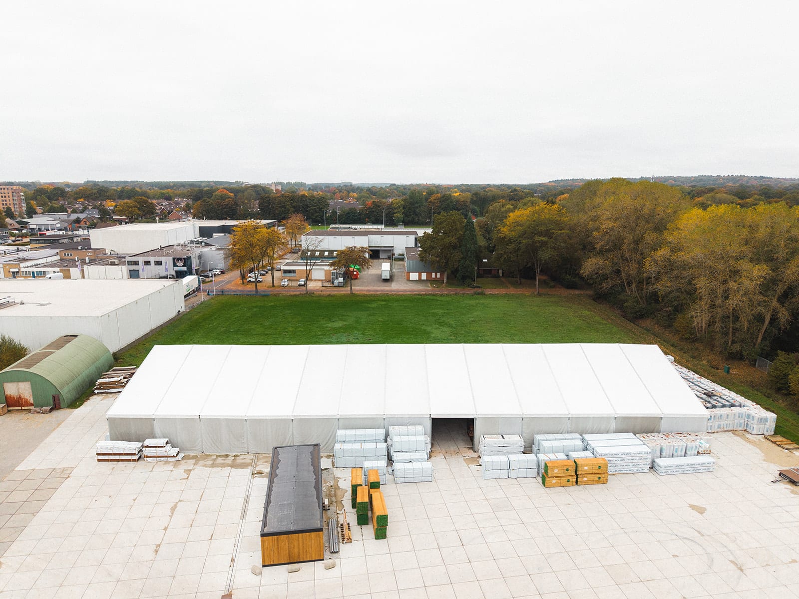 Bij Thermino plaatsten we een T2-tenthal als tijdelijke opslagruimte. Een flexibele oplossing die snel inzetbaar is en precies aansluit bij de logistieke behoefte van het bedrijf. De aluminium constructie biedt voldoende hoogte en bescherming, zodat materialen veilig en droog opgeslagen kunnen worden.
