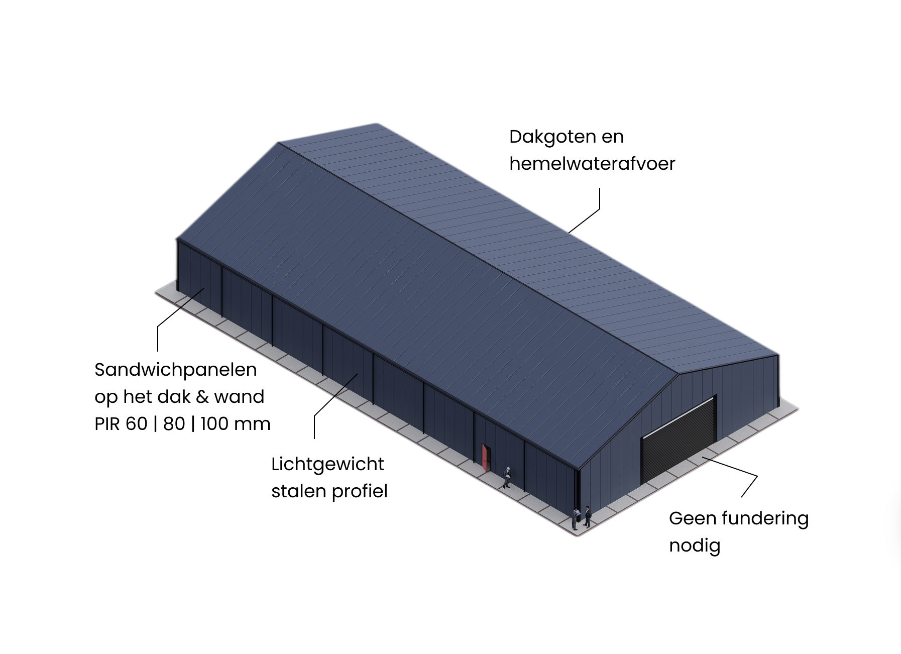 De T5 Flexhal is dé toekomstbestendige keuze voor bedrijven die op zoek zijn naar hoogwaardige bedrijfsruimte. Met snelle productie- en levertijden, modulaire aanpassingen en volledige isolatie biedt deze hal een direct bruikbare oplossing voor opslag, werkruimtes, en meer.